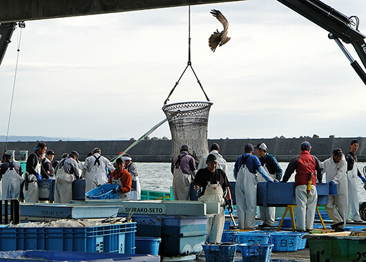 おこぼれを目当てに、たくさんのとんびも船の周りに集まります。